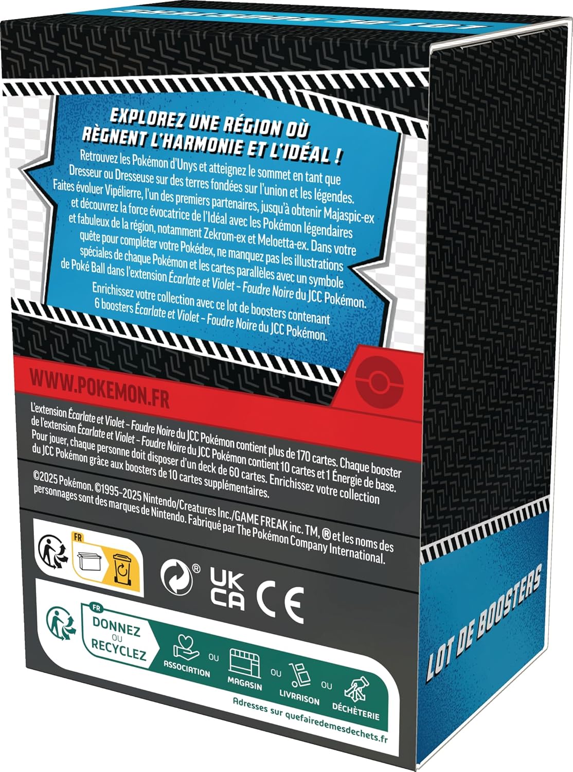 Découvre ce Bundle Pokémon de l’extension Foudre Noire, contenant 6 boosters scellés regroupés dans leur coffret officiel.
